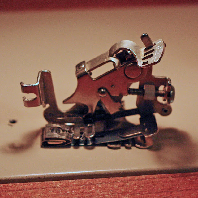 This little delight contains all sorts of goodies, like the feet: general purpose foot, straight stitch foot, seam guide, zipper foot, hemming foot, button sewing foot, multi-slotted binder, and ruffler.
